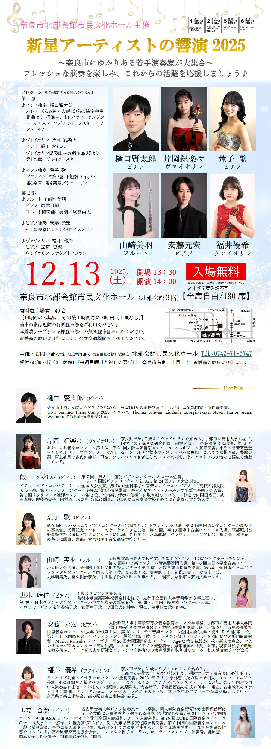 「新星アーティストの響演2025」~奈良市にゆかりのある若手演奏家が大集合~ フレッシュな演奏を楽しみ、これからの活躍を応援しましょう♪ を聴いてきました。 主催者によるオリジナル企画として、今回が初開催とのことです。(有料でもよいので、 今後もぜひ続けてほしい企画です。)出演者は音楽大学在学中の方が多く、若さあふれる 素晴らしい演奏でした。各演奏の後で、司会者からのアットホームなミニインタビューが あり、演奏者の生の声を聴くことができました。これを機会にお気に入りのアーティスト を見つけて、今後の推し活をお願いしますとのことでした。(久しぶりに素晴らしい企画) 場所:奈良市北部会館市民文化ホール(入場無料・申込不要) 日時:2025年12月13日 14:00~16:00(13:30開場) 主催:社会福祉法人 奈良市社会福祉協議会(奈良市北部会館市民文化ホール) ・「新星アーティストの響演2025」のチラシ.jpg(557KB) ・ムジークフェストなら2025より紹介ページ ←ただし、後にリンクが切れるでしょう。![]()